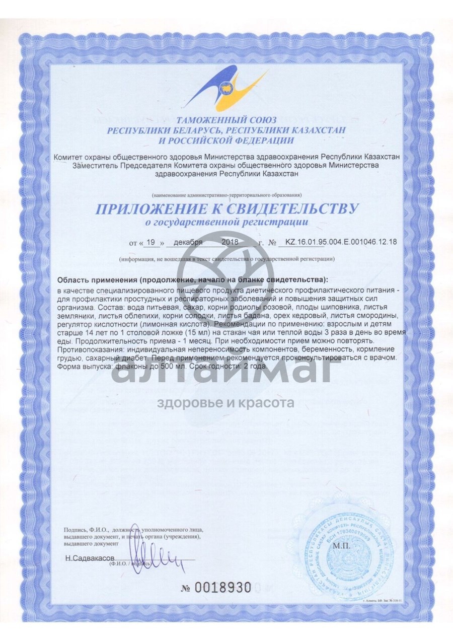 Сахар-песок, вода питьевая, корни и корневища родиолы розовой (золотой корень), плоды шиповника, листья земляники, листья облепихи, корни и корневища солодки, листья бадана, орех кедровый, листья смородины, регулятор кислотности (лимонная кислота).