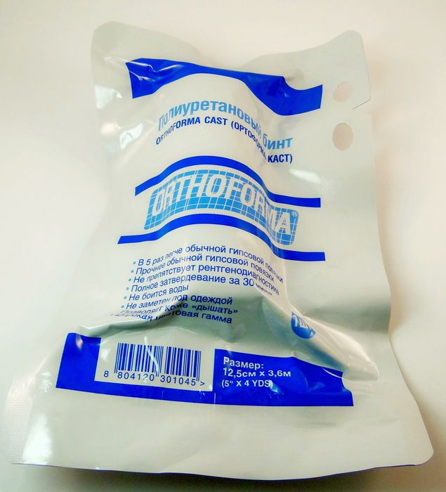 Полиуретановый бинт для иммобилизации различных сегментов опорно-двигательного аппарата после травм и операций, сопровождающихся повреждением костной структуры и капсульно-связочного аппарата (переломы, вывехи, подвывихи и пр.). Ширина 12,5 см, длина 3,6 м.