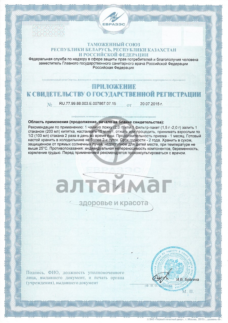 Профилактическое средство при бронхите, кашле, болезненных менструациах, в качестве мочегонного при отеках почечного происхождения, а также головокружении.